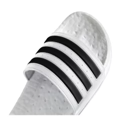 Zum schnellen Hineinschlüpfen hervorragend geeignet sind die weiß-schwarzen adidas Adilette Boost Badeschuhe für Herren. Ihr Schaft besteht aus einem hochwertigen Kunstleder und die Innenseite ist mit einem strapazierfähigen Material gefüttert, das für mehr Komfort sorgt.