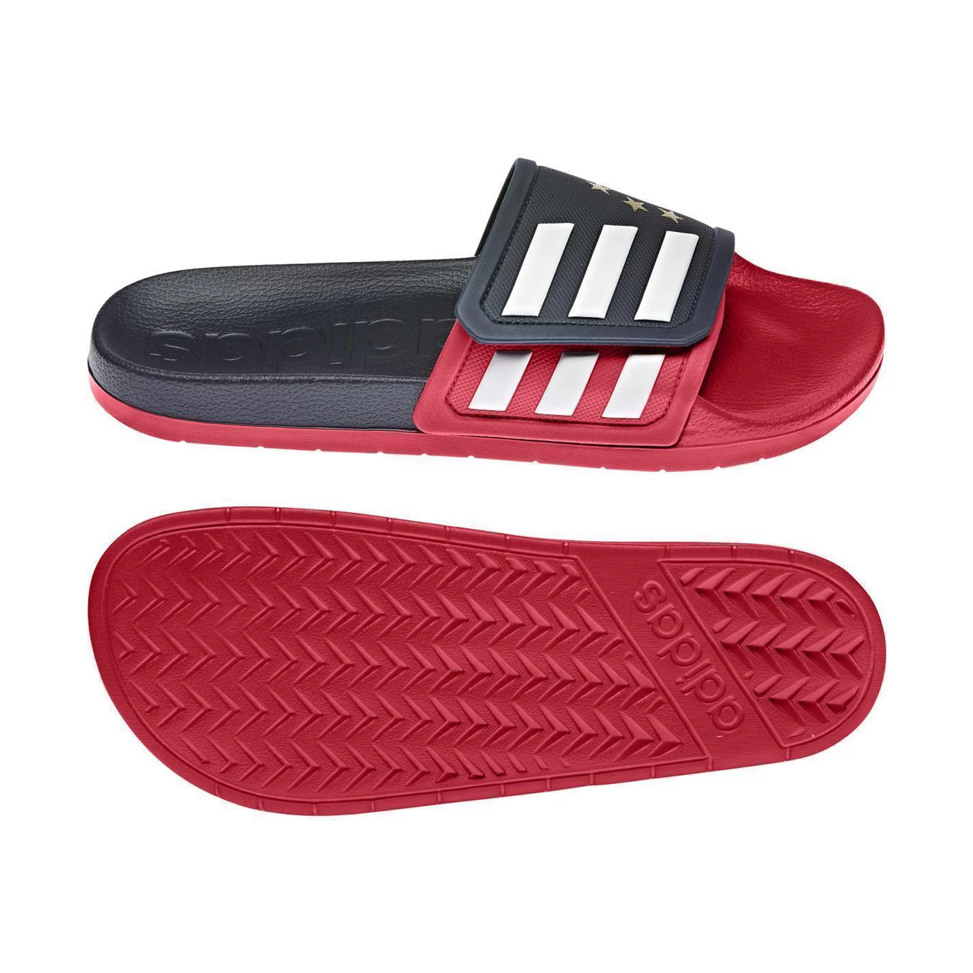 Für Fans des deutschen Rekordmeisters und sechsfachen Championsleague-Siegers FC Bayern München sind diese leichten adidas Adilette TND Badeschuhe für Herren in den Farben Dunkelblau/Rot ein absolutes Muss. Sie bieten den nötigen Komfort für die Dusche oder am Pool. Das Obermaterial der Klettbandage sorgt für eine individuelle Passform. Die schnell trocknende Cloudfoam-Zwischensohle bietet auf jedem Untergrund ein angenehmes Gehen. Die 3-Streifen über der Oberseite verleihen diesen Slides einen klassischen Look.