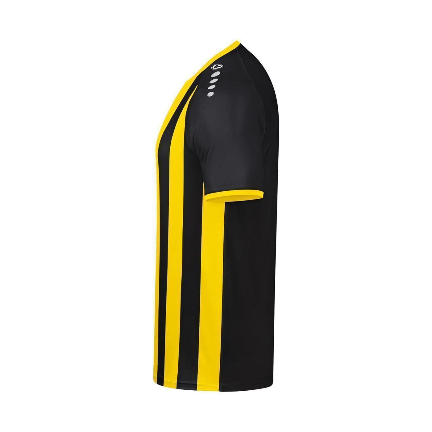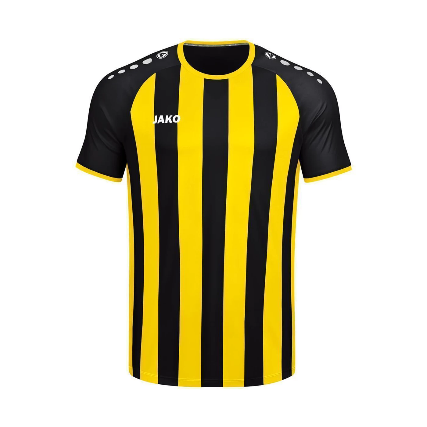 Das schwarz-gelb gestreifte Jako Trikot Inter Kurzarm für Kinder ist atmungsaktiv und strapazierfähig. Sein Interlock-Polyester ist strapazierfähiger und elastischer als vergleichbare Stoffe wie etwa Single Jersey. Der Rücken aus Micro-Mesh macht das Streifen-Trikot besonders atmungsaktiv. Zur Schonung von Ressourcen hat Jako dieses Kurzarmtrikot zu 100% aus recyceltem Polyester hergestellt.