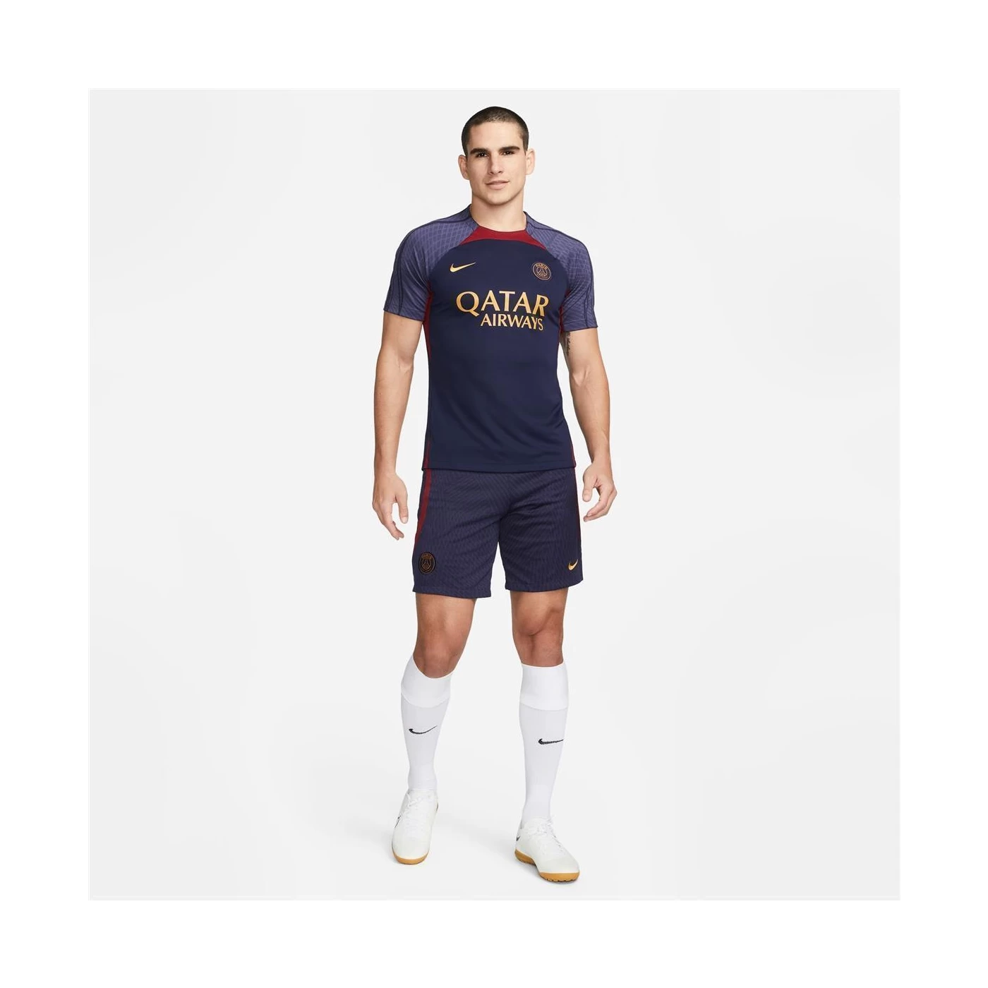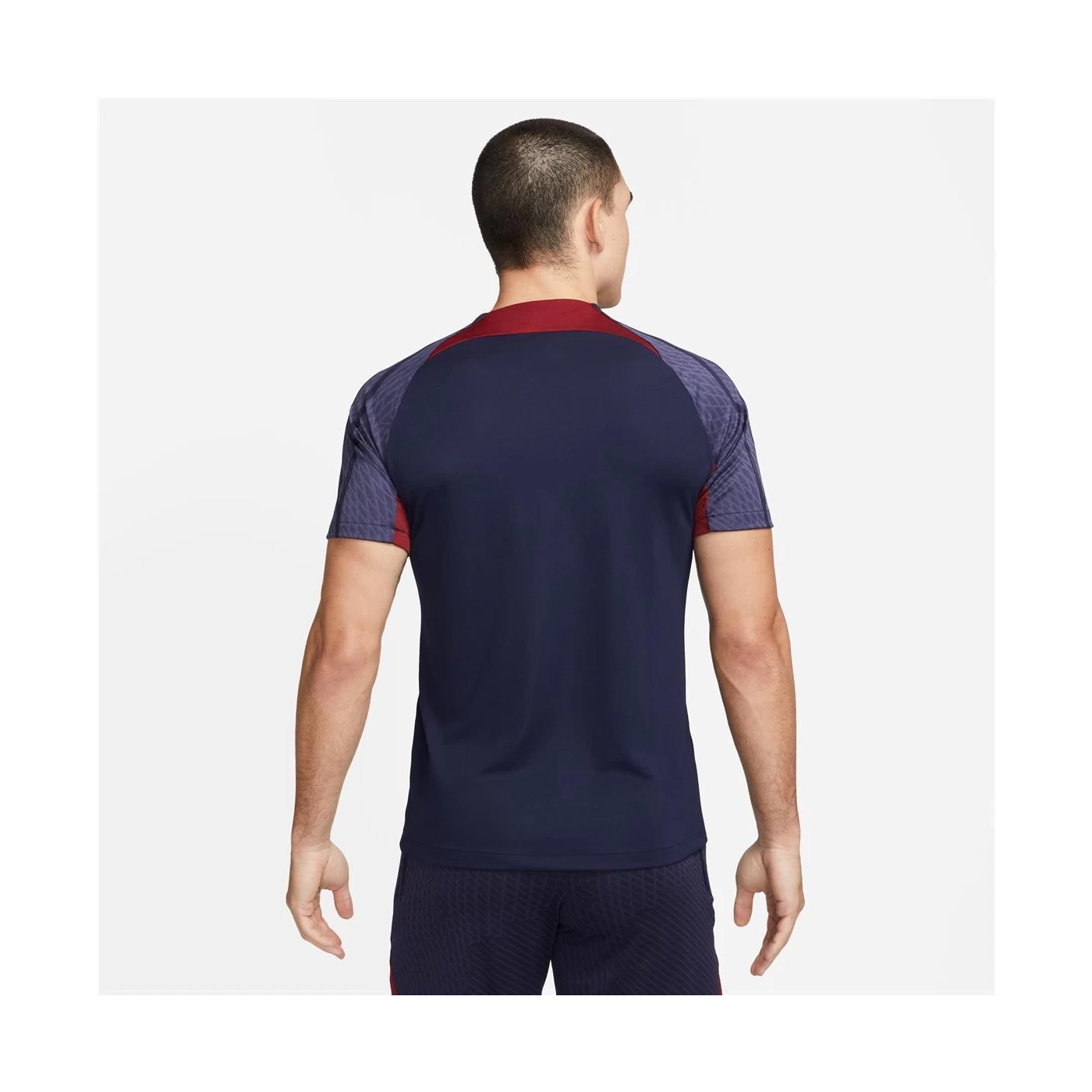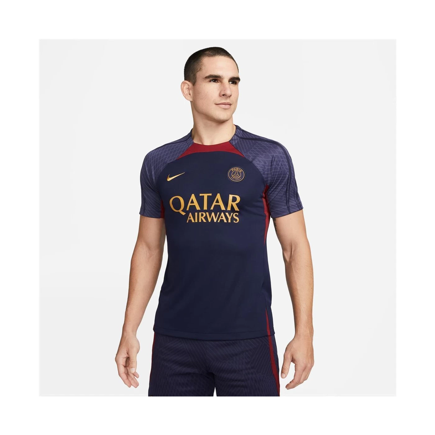 Mit dem dunkelblau-roten Nike Paris Saint-Germain Strike Trainingstrikot für Herren zeigst du deinen Stolz auf den französischen Spitzenverein mit den Superstars Lionel Messi, Kilian Mbappé und Neymar.